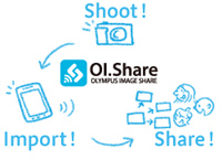 E-PL5に搭載されたスマートフォン接続機能と、FlashAir(別売:Wi-Fi内蔵SDHCカード)、専用のスマートフォンアプリ『OI.Share(2012年10月公開予定・iPhone/Android対応)』を用いることで、カメラとスマートフォンの接続が簡単にできるようになりました。簡単操作で画像をスマートフォンに取り込み、スマートフォン上でアートフィルターをかけたり、SNSアプリと連携して写真をシェアすることが手軽にできます。
