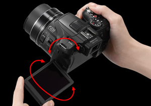 モニターには、左右に180度、上下に270度、自由な位置に回転可能なフリーアングル液晶を採用しました。地面すれすれのローアングルや、腕を高々と伸ばしたハイアングル、自分撮りなど、フレーミングの難しいシーンも液晶でしっかりと確認しながら撮影できます。