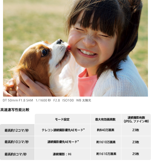 α57は、一瞬をとらえる高速連写性能が進化。4つの連写モードから選べるようになりました。スポーツシーンはもちろん日常の何気ない一瞬の表情まで、さまざまなシーンに合わせて高速連写ができます。