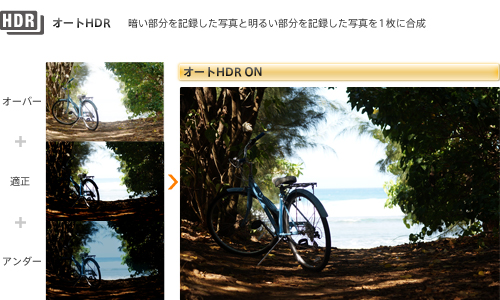 明暗差が大きい場面で、目で見たままの印象を再現できる「オートHDR(ハイダイナミックレンジ)」機能。通常カメラでは白とびや黒つぶれを起こしてしまうシーンでも、露出の異なる3枚の画像を合成することで、暗い部分は黒つぶれせず、明るい部分も階調をしっかり残して表現できます。設定は「オート」のほか、露出差レベルを1.0-6.0EV間で1.0EVごとに設定できる「露出差レベル設定」から選択できます。