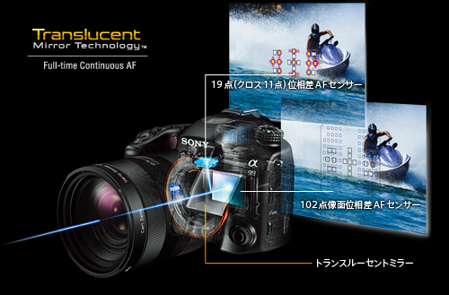 クロスセンサーを11点配置した19点位相差AFセンサーに加え、イメージセンサー上に位相差AFセンサーを埋めこんだ102点像面位相差センサーを採 用。イメージセンサーとAFセンサーに常に光を導く「トランスルーセントミラー・テクノロジー」により、静止画撮影時にこれら2つのAFシステムが同時に 駆動。19点AFセンサー上から被写体が外れた場合でも、102点多点像面位相差センサー(*2)が面で被写体を捉え続けてピントを合わせる、高精度・高 速AFシステムを実現しました。