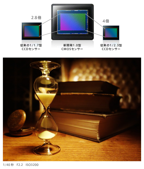 大型1.0型(13.2×8.8mm)“Exmor(エクスモア)”CMOSセンサーを新開発。従来のサイバーショットで採用されているCMOSセンサーと比べ、約4倍の受光面積を持つため、大口径F1.8カールツァイス「バリオ・ゾナーT*」の優れた描写を余すところなく受け止めます。また、有効約2020万画素の描写性能により、被写体の細かなディテールまで忠実に再現。さらに、ノイズを初期段階から抑えるため、センサー上でオンチップ・カラムA/D変換とデュアルノイズリダクション処理を行い、ノイズを最小限に抑制し高画素化と低ノイズ化を実現しています。