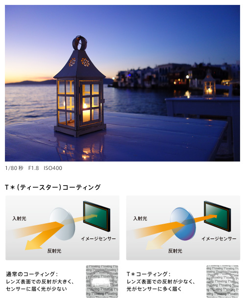 厳密な性能テストに合格し、カールツァイスの「バリオ・ゾナーT*」の名を冠した光学3.6倍ズームレンズを搭載。広角28mm(35mm判換算)側の開放F値はF1.8と明るく、7枚羽根円形絞りと合わせ美しいボケ味を実現します。レンズには、ゴーストやフレアなど不要な反射光を低減する多層膜コーティング、「T*(ティースター)コーティング」を施しています。これにより圧倒的な描写性能を発揮し、シーンの空気感まで表現します。