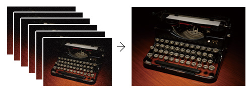1回のシャッターレリーズで高速連写した6枚の画像を重ね合わせることでノイズを低減する「マルチショットNR(ノイズリダクション)」機能を搭載。同じ絞りやシャッタースピードでも最大でISO感度約2段分のノイズ低減効果が得られ、最高ISO25600相当(*)に拡張した高感度撮影も可能です。P・A・S・Mモードでも設定できるので、撮影の自由度がさらに高まります。