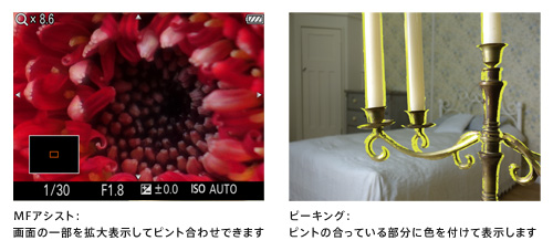 マニュアル操作でピント合わせを行うときに、画面の一部を拡大して表示する「MFアシスト」機能を搭載。約8.6倍または17.1倍に拡大できるので、マクロ撮影などで厳密なピント合わせが可能です。また、画面内でピントの合っている部分の輪郭を指定された色をつけて表示する「ピーキング」機能にも対応。液晶画面で全体を見ながら、どこにピントが合っているか一目で確認できます。