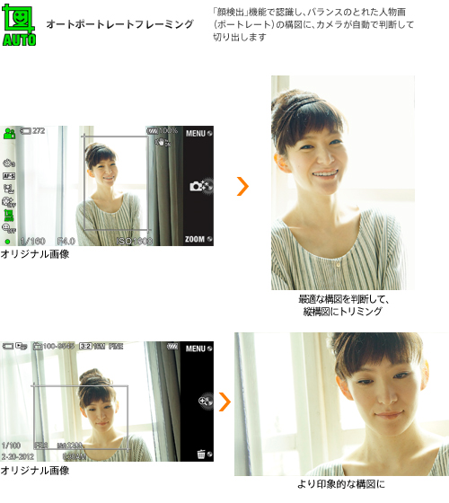 撮影した画像をバランスのとれたポートレートの構図になるようにカメラが自動で切り出す「オートポートレートフレーミング」。なにげなく撮ってしまう写真も、より印象的に仕上げることができます。また、自分の撮ったオリジナル画像も一緒に保存されるので、カメラが判断した構図と比べることができ、プロのような構図をわかりやすく学べます。