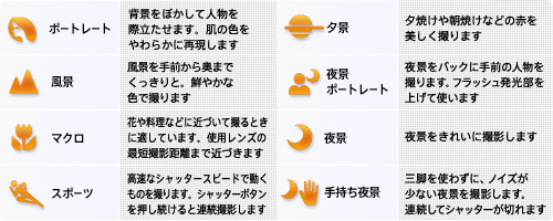撮りたい撮影シーンを8つのモードの中から選択するだけで、カメラが自動的に絞りやシャッタースピードはもちろん、ホワイトバランスや画質まで、シーンに最適になるようコントロールします。「ポートレート」「風景」「マクロ」「スポーツ」「夕景」「夜景ポートレート」「夜景」「手持ち夜景」モードの8種類から選択できます。