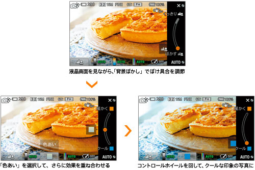 写真やカメラに詳しくなくても、さまざま写真表現を楽しめる「マイフォトスタイル」を搭載。背景のぼけ具合を自在に調節できる「背景ぼかし(*)」をはじめ、「色あい」「明るさ」「鮮やかさ」「ピクチャーエフェクト」の5項目の効果から選んで、液晶画面を見ながら調節できます。たとえば、「背景ぼかし」の後に、「色あい」の効果を重ね合わせるなど、自分のイメージ通りに写真を仕上げられます。「おまかせオート」モードから、コントロールホイールやソフトキーを使って直感的に操作でき、一眼カメラならではの写真表現を自在に楽しめます。また、「マイフォトスタイル」は、動画撮影時にも活用できます。