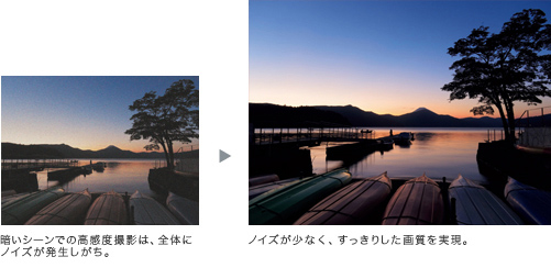 ノイズの発生を抑える 暗いところを撮影する時に、感度を上げると増加しがちな画像ノイズを抑えることで、高感度でもクリアな画質を実現します。