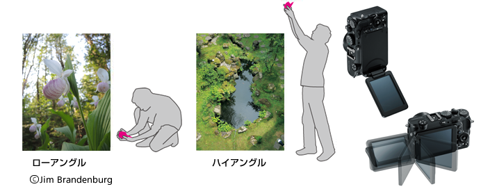 機動力に優れた軽量・堅牢なマグネシウム合金ボディーに、上下左右に可動するバリアングル液晶モニターを搭載しました。広い回転角で撮影アングルの自由度をさらに拡大。斜めからでも見やすく、縦位置撮影や自分撮りなどもラクな姿勢で行えます。超高精細な大画面と忠実な色再現で一段と厳密な構図づくりを実現します。