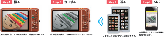撮影直後の写真を加工してスマートフォンにワイヤレスで送れます。画質が落ちにくいカメラ加工なら、SNSのマイページを自信作で飾れます。