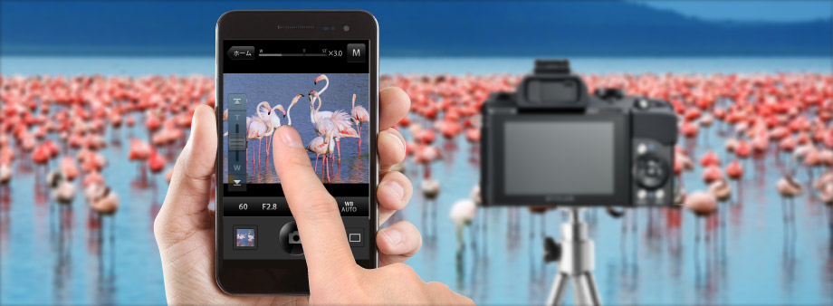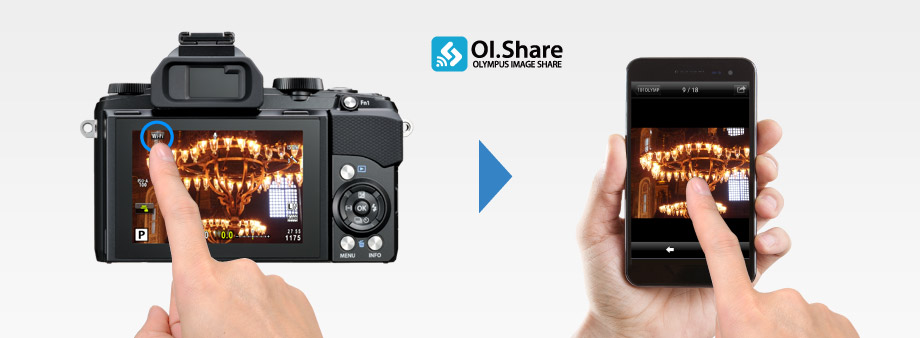 すばやく簡単にスマホと連携できるWi-Fiを内蔵※。スマホ用のアプリ「OLYMPUS Image Share」と連携させることで、カメラ内の写真をスマホに転送したり、スマホを使ってのリモート撮影やズームも可能です。また、スマホのGPSタグをカメラ内の写真に追加できます。