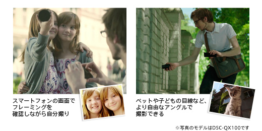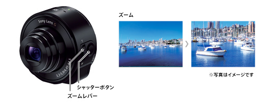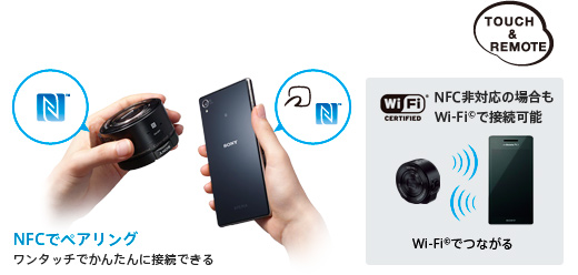 スマートフォンとかんたん接続 スマートフォンに専用アプリ“PlayMemories Mobile”をインストールすれば、複雑な設定や操作をすることなく、Wi-Fi(R)でQX10に接続できます。NFCなら、さらにかんたんにワンタッチで接続可能。QX10での撮影や各種設定も、スマートフォン側から行えます。