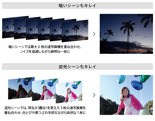 シーンや撮影者の状況に合わせて、最適な設定に自動調整してくれる「プレミアムおまかせオート」。暗いシーンでは、高速・高精度な画像処理によって最大6枚の連写画像を重ね合わせてノイズを低減。さらに、新たな信号処理技術により、暗所での画質が向上しています。また、逆光シーンでも、明るさ(露出)を変えた3枚の連写画像を重ね合わせ、白とびや黒つぶれを抑えて自然な一枚に仕上げます。