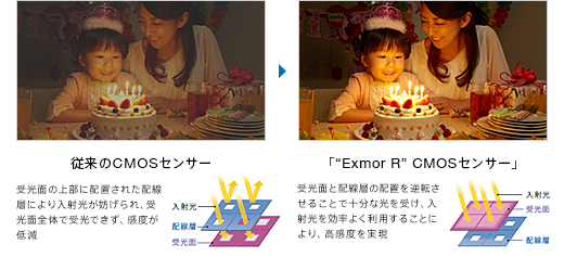 16:9型の「“Exmor R” CMOSセンサー」を搭載。16:9型を採用しているので動画の有効画素数が大幅にアップ、さらに高精細な映像が得られます。