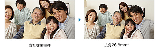「Gレンズ」に加え、16:9の「“Exmor R” CMOSセンサー」を採用することで、ワイド端で、動画でも静止画でも26.8mm(*)というひろびろワイドな広角撮影を楽しめます。室内での大人数のパーティなど、後ろに下がれない場所での撮影や、建築物・風景の描写に大活躍。撮りたいもの全体をしっかりと画面の中に納められます。