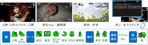 「顔」「シーン」「揺れ」「屋内・屋外」の4つの要素に加えて、カメラが自動で風のノイズを検知する「風ノイズ」の5つの要素から撮影シーンを認識。180通りの組み合わせの中から、撮影状況に合わせた最適な映像が取れるように自動設定。いつでもだれでも、美しい映像が残せます。