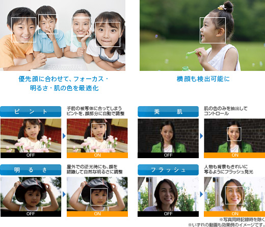 カメラが自動的に検出した複数の人物から優先したい顔にタッチすれば、“フォーカス”“明るさ”“肌の色”を優先的に最適化する「優先顔キメ機能」がさらに進化。正面だけでなく横顔でもしっかり検知します。 さらに、顔検出に連動して、人の声認識し、周りのノイズを低減してくれる「くっきり音声」も新しく搭載しました。