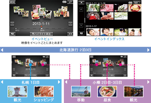 カメラが撮影の頻度を検知。撮影日時情報と合わせて映像を自動的にイベントごとにまとめます。再生画面上で並んでいた映像も、これからは結婚式や運動会などのイベント別にかんたんに楽しめます。 「イベントビュー」なら、2日にわたる旅行の映像を1つにまとめて、「ハイライト再生」で見ることができます。また、イベントのスケールを2段階まで調整することもできますので、例えば「観光」「昼食」など、さらに細かなコンテンツ別に見られます。