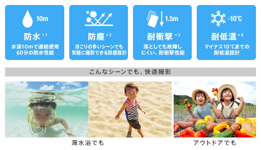 水深10mで60分連続使用できる防水性能(*1)をはじめ、防塵性能(*2)や1.5mの高さから落としても故障しにくい耐衝撃性能(*3)、さらにマイナス10℃までの耐低温性能(*4)を備えたタフな防水ボディを実現。スイミングやダイビング、スキーなどさまざまなアウトドアで水や砂、天候を気にせずに撮影できます。また、入学式、卒業式、家族旅行などでの突然の雨や雪でも安心して撮影できます。