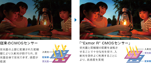 16:9型「“Exmor R” CMOSセンサー」 16:9型の「“Exmor R” CMOSセンサー」を搭載。16:9型を採用しているので動画の有効画素数が大幅にアップ、さらに高精細な映像が得られます。 暗いシーンも、鮮明に どんなシーンでも、高精細で高画質な映像を実現。とくに、夜景や暗い場所での撮影に威力を発揮。ノイズを低減し、美しく鮮やかに撮れます。