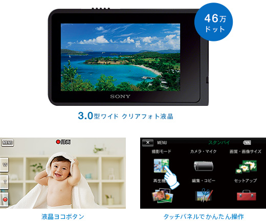 コンパクトな本体ながら、大きな画面で使いやすい3.0型ワイドクリアフォト液晶を搭載。また、写り込みも大幅に削減。すっきり見やすい表示を実現しました。 また、快適に操作できるタッチパネルを採用。タッチパネル内に録画スタート/ストップボタン、ズームボタンも再現しました。