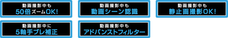 新開発の5軸手ブレ補正を搭載し、動画撮影時のさまざまな動きや手ブレを低減。 光学式手ブレ補正「2軸OIS(図中①、②)」と電子式手ブレ補正「3軸DIS(図中③、④、⑤)」の2つの手ブレ補正が50×での望遠撮影や動きのある撮影でも威力を発揮します。
