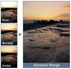 高速マルチフレーム処理により、露出の異なる2枚以上の画像を重ね合わせ、白とび・黒つぶれの少ない自然な階調の画像が撮影できます。