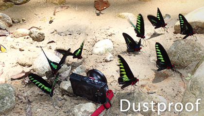 TG-3の防塵機構は、高い気密性で砂やホコリの侵入を防ぎます。また、汚れた際には水道の水でジャブジャブと洗い流せるので、環境を選ばず過酷な場所で安心して使えます。