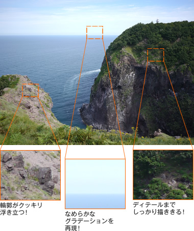 ヴィーナスエンジンに被写体に合わせた最適な画像処理を行う「超解像技術」を搭載。画像の輪郭部、ディテール部、グラデーション部をカメラが自動で分析。それぞれに最適な画像処理を行うことにより、被写体の細部まで描き出す高い解像感と、豊かな階調表現を実現しました。 さらに、「拡張モード」を使えば、写真全体のバランスを最適化した自然なエッジ強調と解像感を実現します。 ●[拡張]モード使用時は、連写の速度が遅くなります。