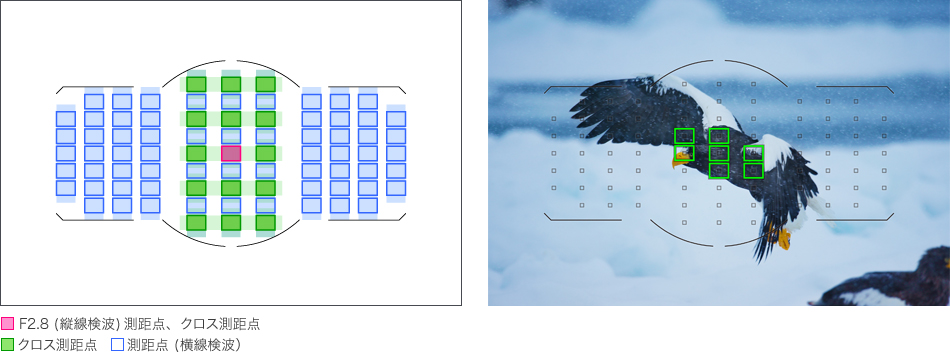 新開発の位相差AFセンサーでは、79点(*)フォーカスポイントが画面の40%以上をカバー。使用頻度の高い中央部15点には、より精度を高めるクロスセンサーを採用。広範囲におよぶフォーカスエリアが被写体を面で確実に捉え、捕捉後も高い追随性で的確にピントを合わせ続けます。さらに中央測距点にはF2.8対応のセンサーを重ねて配置。シビアなピント精度が要求される大口径レンズ使用時でも高い合焦精度を実現しています。