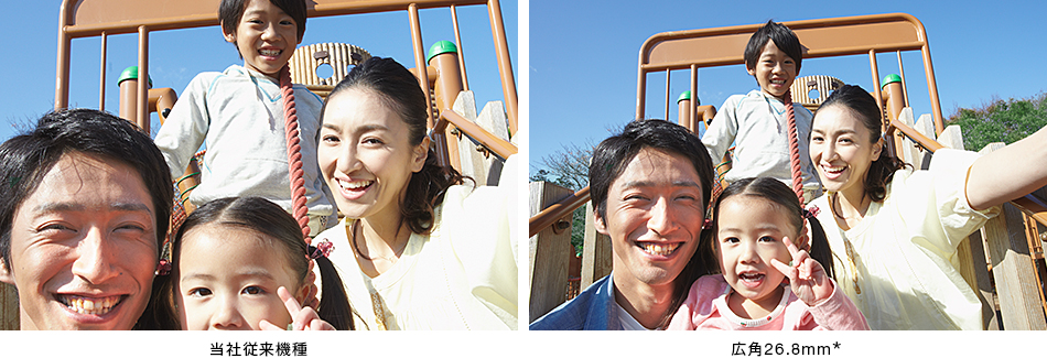 「Gレンズ」に加え、16:9の「Exmor R CMOSセンサー」を採用することで、ワイド端で、動画でも静止画でも26.8mm(*)というひろびろワイドな広角撮影を楽しめます。室内での大人数のパーティなど、後ろに下がれない場所での撮影や、建築物・風景の描写に大活躍。撮りたいもの全体をしっかりと画面の中に納められます。