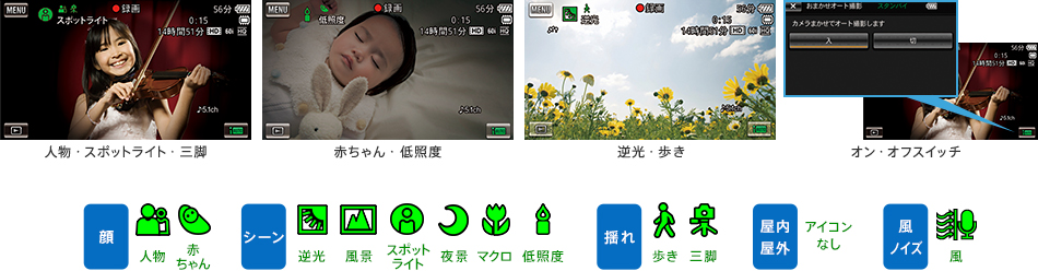 「顔」「シーン」「揺れ」「屋内・屋外」の4つの要素に加えて、カメラが自動で風のノイズを検知する「風ノイズ」の5つの要素から撮影シーンを認識。180通りの組み合わせの中から、撮影状況に合わせた最適な映像が取れるように自動設定。いつでもだれでも、美しい映像が残せます。