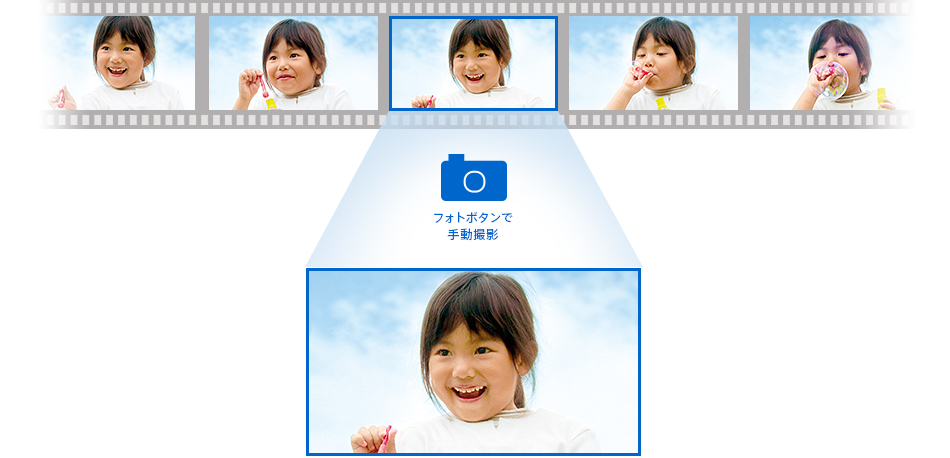 動画撮影中にフォトボタンを押すと、最大920万画素相当(16:9)の写真を同時に記録できます(*)。動画でも写真でもベストシーンを残せます。スマイルシャッター機能でも撮影。笑顔を検出して自動で撮影される「スマイルシャッター」の写真も、920万画素相当(16:9)の高画質で記録します。