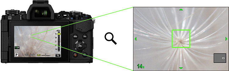 ライブビュー画面を拡大表示して、ピント合わせをサポートする拡大ライブビューは、最大14倍の表示が可能です。スーパースポットAFは、拡大表示されたライブビュー画像の中心部分のみをAFポイントにする機能で、最大約70倍のAFエリアでピント合わせが可能です。拡大表示の際も強力な手ぶれ補正により、ファインダー像が安定するので、マクロ撮影や望遠撮影時の精緻なピント合わせに便利です。