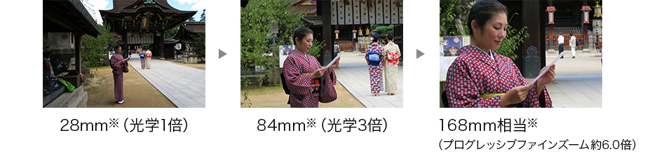広角から望遠まで一台で対応できる、幅広い焦点距離を実現。広がりのある風景をワイドに切りとることも、離れた被写体を引き寄せて写すことも、高画質に楽しめます。さらに、先進のデジタルズームを搭載。プログレッシブファインズームで高い解像感を保ったまま、168mm相当※(約6.0倍)までズーム撮影が楽しめます。