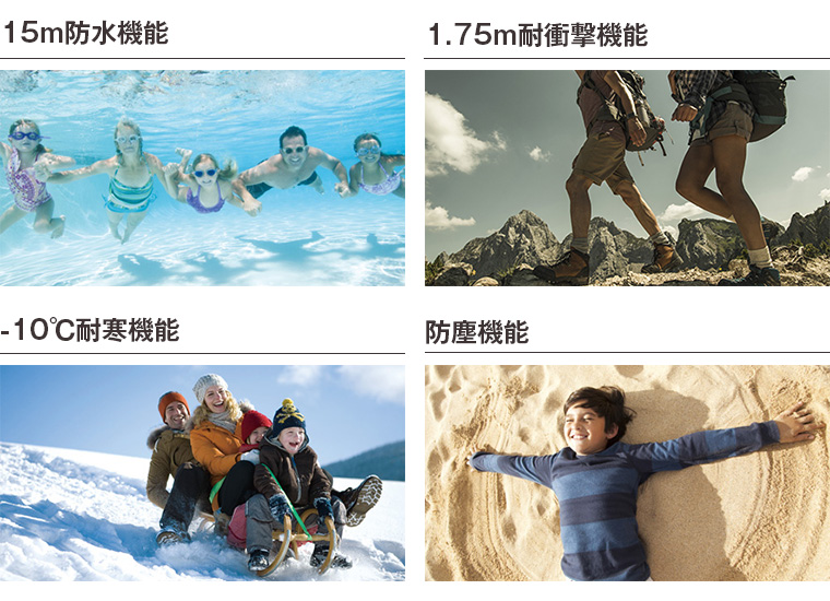 15m防水、防塵や1.75mからの落下にも耐えうる耐衝撃、-10℃までの耐寒など4つのタフネス機能搭載(*1)