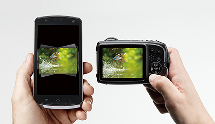 | 「Wi-Fiボタン」をワンプッシュするだけで、写真をスマートフォンやタブレットへ送信できます。IDやパスワード入力も不要で、カンタンに仲間と写真をシェアしたりSNSへのアップが楽しめます。 リモート撮影(*3) | スマートフォンやタブレットを使ってリモート操作撮影ができます。ズーム設定や動画切換も遠隔操作でき、近づくのが難しい野生動物や厳しい自然環境での撮影時に重宝します。 |