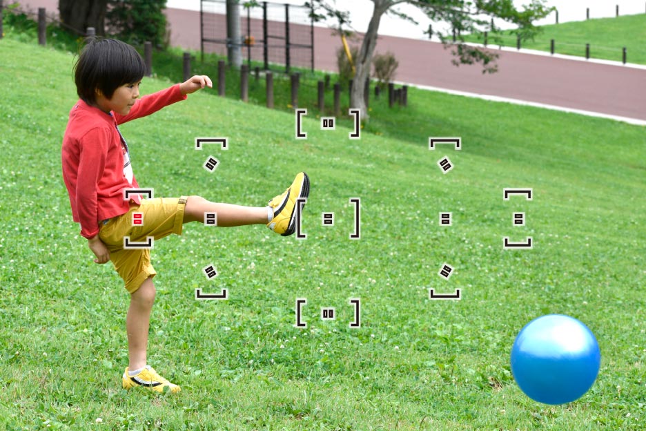 ファインダー撮影には、11点のフォーカスポイントで撮影画面を広くカバーするオートフォーカスを採用。素早く正確に被写体を捉え、高精度にピントを合わせます。特によく使う中央の1点には、被写体をより確実につかまえられるクロスタイプセンサーを採用しています。また、撮影シーンを細かく分析するシーン認識システムにより、高精度に被写体を判別したり、構図変化に合わせてピントを合わせ続けたりすることもできます。