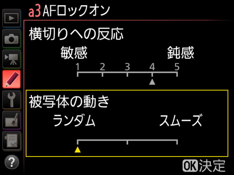 複数のプレイヤーで行うスポーツ競技等を撮影する場合、特定の選手を撮り続けたいスピードスケートのような競技と、ゲームの主導権を握る選手が次々と入れ替わるラグビーやサッカーのような競技とでは、求められるAF追従特性がおのずと異なります。D500では、この要求にフレキシブルに対応するため、カスタムメニューのAFロックオンの設定方法を改良。「横切りへの反応」(カメラ前を横切る障害物へのAFの反応)を[敏感](横切った被写体に素早く反応してピントが合いやすく、横切り被写体通過後は素早く元の被写体にピントが合う)~[鈍感](横切る被写体があっても、元の被写体からピントが外れにくい)で設定し、「被写体の動き」の特徴を[ランダム](動きの速度が急激に変わる)~[スムーズ](ゆるやかな速度変化で動く)で設定することで、撮影目的に最適なAF制御を直感的に設定できます。