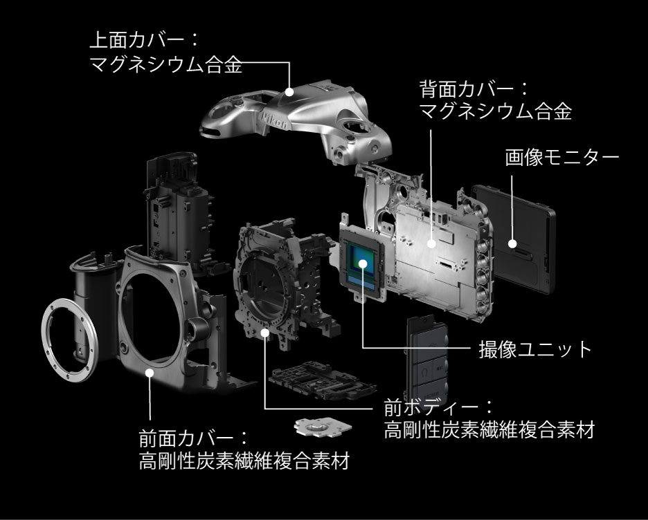 高剛性炭素繊維複合素材を用いた、内部構造を堅固に守るモノコック構造を採用。マグネシウム合金の上面カバー、背面カバーと相まって、酷使に耐える強度と剛性を確保しつつ軽量化を実現。ボディーも薄くなり、深いグリップでホールド性も向上しています。また、シーリング処理などにより、DX最上位機種にふさわしい防塵・防滴性能も確保しています。