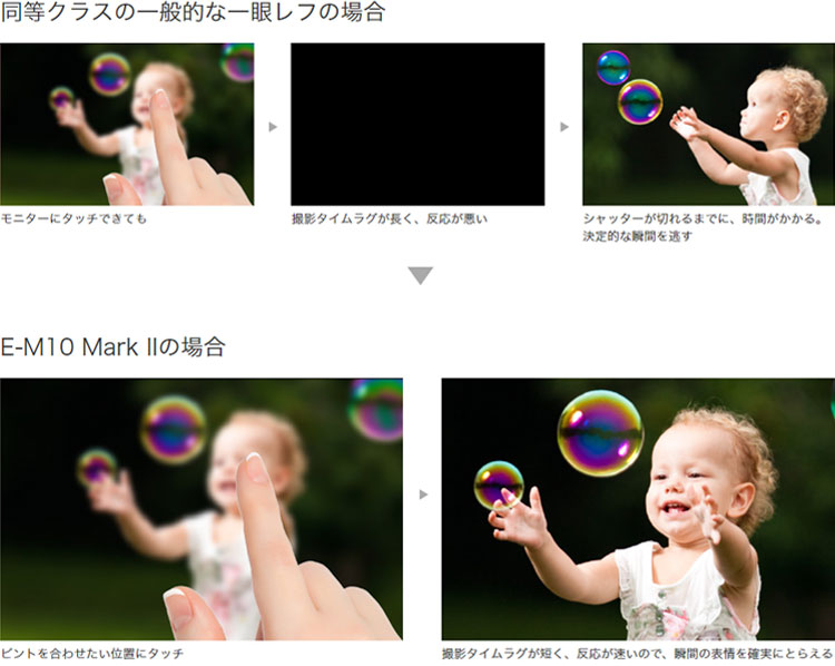 背面モニターに写る被写体に指でタッチするだけで、瞬間的に被写体をとらえて撮影できる「タッチAFシャッター」を搭載。撮影のタイムラグが短く、タッチ反応も速いので、撮りたい瞬間を確実に残せます。