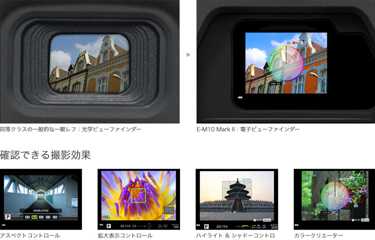 明るさ、色合い、鮮やかさなどの撮影効果(写真の仕上がり)をファインダーで確認しながら撮影できます。一般的な一眼レフの光学ファインダーではできない優れた機能です。