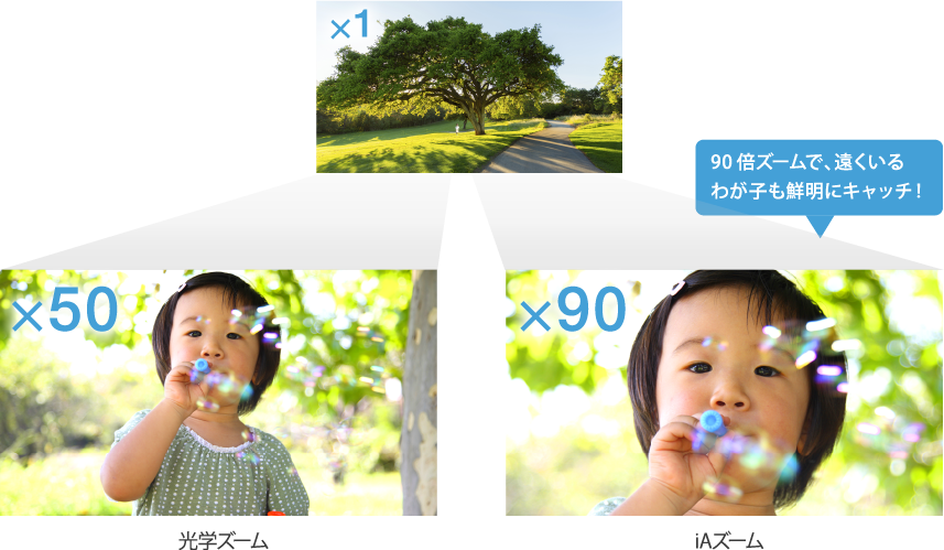 光学50倍/iA90倍の高倍率ズームを実現。とても遠くに離れている家族の笑顔や、スポーツに熱中している子どもの姿などを大きくキレイに撮れて、ハイズームでも鮮明&きめ細かく写せます。
