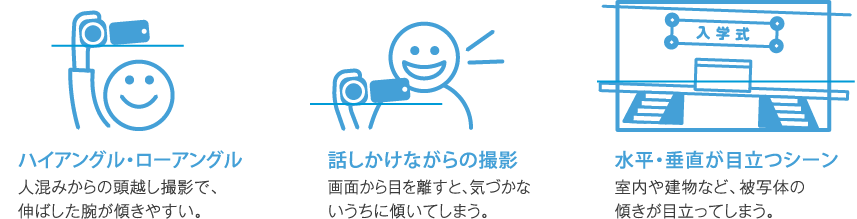 カメラ本体が傾いていても、撮影中の映像を自動で水平にしてくれる「傾き補正」を搭載。撮影シーンに合わせて2種類(標準/強※)の補正範囲を選べるので、通常の撮影時はもちろん、腕を高く上げての撮影や話しながらの撮影など、液晶パネルで水平を確認しづらい場面で特に効果を発揮します。