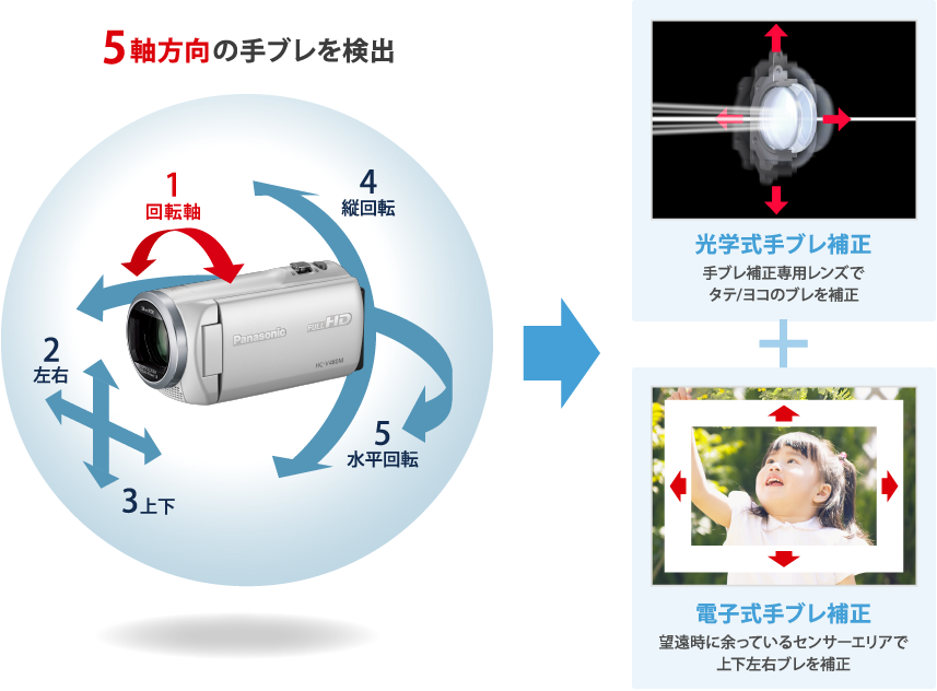 回転軸・左右・上下・縦回転・水平回転の5軸方向の手ブレを自動補正する「5軸ハイブリッド手ブレ補正」を搭載。高倍率ズーム時・暗い場所・歩行時など手ブレが起きやすいシーンでも、しっかりと補正して記録できます。