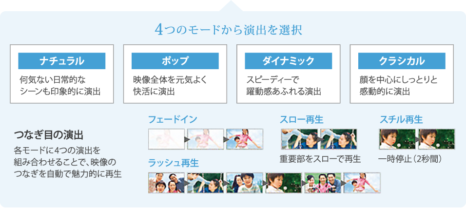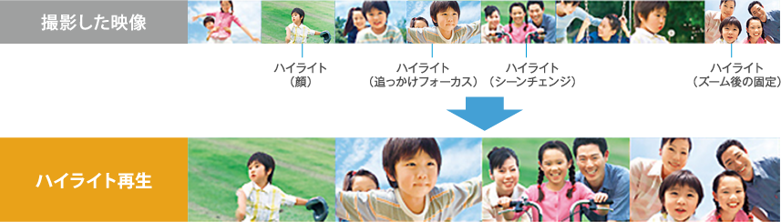 撮影した映像の中からカメラが自動でハイライトシーンを抽出し、演出効果やBGMとともに短縮して再生。長時間イベントを短時間で見たい時などに便利なダイジェスト版の映像が、ショートムービー感覚で楽しめます。保存形式は、高画質なAVCHDと、PCで扱いやすいMP4の2種類から選択できます。