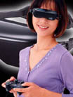 このEye-Trekはビデオ機器に接続し、サングラスのようにかけるだけで、臨場感溢れる大画面を楽しめるパーソナルディスプレイで、FMD-20P はプレイステーション2専用に商品化されています。また、2メートル先に52型相当の大画面を体感でき、ディスプレイ部は世界最軽量の85g 、コントロール部も超小型軽量の35g です。