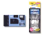 コニカは、カラーネガ現像処理で白黒調の画像を得ることができる35mmサイズのネガフィルム"Konica MONOCHROME VX400" を内蔵し、おしゃれなモノト-ン写真が気軽に撮影できる「撮りっきりコニカMiNi MONOTONE 24枚撮りフラッシュ付」を9月20日より発売します。モノトーン写真とは単一色だけで構成される写真表現のことで、白黒フィルムを使ったときに得られるコントラストが強いプリントとは異なり、やわらかで味わい深い表現が得られます。