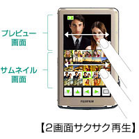タッチパネル方式の液晶モニターを採用した、直感的な操作が特徴のコンパクトデジタルカメラ。撮影した画像をモニター上で見る場合の新機能として、「2画面サクサク再生」が利用できます。これは、ワイド画面の長い液晶モニターを縦にしたときに、上下2画面に分けて画像を表示し、その上と下を、それぞれ別々に操作できるという機能です。上側には大きなプレビュー画像を1点、下側には小さくサムネイルの複数画像を表示して、必要な画像を探すなどの使い方ができます。